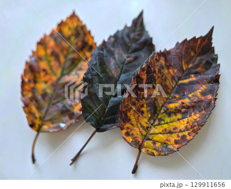 Three Decaying Colorful Autumn Leaves Showcasing Textures and Shades on Neutral Backdrop