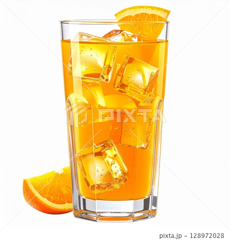 Tall Glass of Refreshing Orange Juice with Ice Cubes and Citrus Slice Isolated