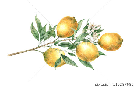 Branch with yellow lemons, green leaves and white delicate flowers. Isolated watercolor illustration in realistic style. Handmade composition for decorating cards, wedding design, invitations, textile