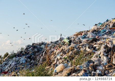Rubbish piles tower under the sun, while birds soar overhead, illustrating the clash between nature and human waste in a city landscape
