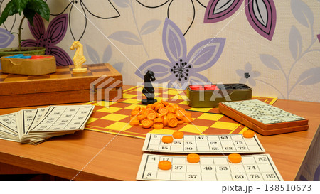 close up of lotto cards and chess pieces on the game board on a table in the room