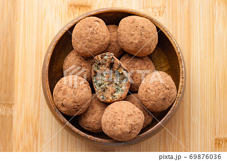 Homemade healthy vegan raw energy truffle balls with dates and walnuts,matcha powder,cocoa powder on light background