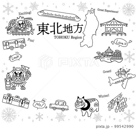 日本の東北地方の名所観光とマップ、アイコンのセット(線画)