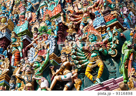The beautiful Meenakshi Amman Temple in Madurai in the south Indian state of Tamil Nadu - close up of idols and decoration