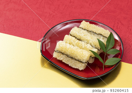 おせち料理その11_赤皿の子持ち昆布_背景金