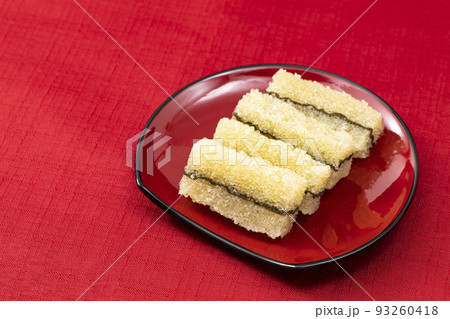 おせち料理その11_赤皿の子持ち昆布_背景赤と金