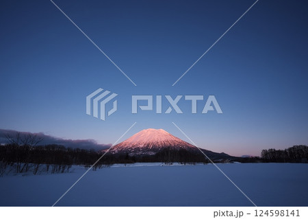 冬の北海道 羊蹄山の西側から夕焼けに染まる羊蹄山を臨む