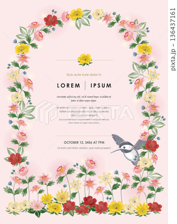 Victorian bird and roses, border, seamless pattern. Vintage flowers, botanical arrangement. Romantic anemone and peony. For greeting cards, wedding, fabric, printing. Graphic vector line, hand drawn