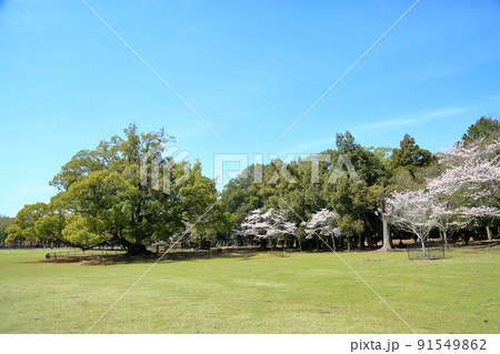 春の飛火野 楠 大木
