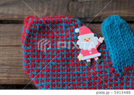 手編みの手袋から顔をだすサンタクロース 手編みのニット