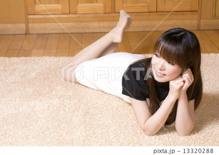 ラグマットの上で寝転がる女性