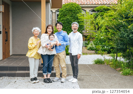 住宅の前で赤ちゃんを笑顔で囲む三世代家族の集合写真