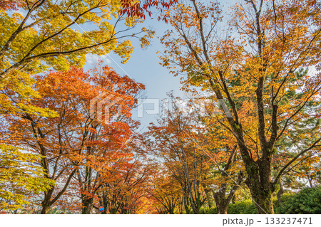 京都府立植物園前の鮮やかに黄葉したケヤキ並木
