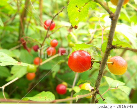 新緑に中で朝日を浴びて完熟を迎えた「ニワウメの実」