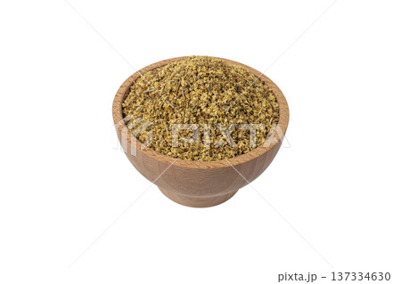 dried flowers of black lilac or black elder in latin sambuci flos in wooden bowl isolated on white background.Herbs. Alternative medicine.