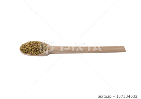 dried flowers of black lilac or black elder in latin sambuci flos on wooden spoon isolated on white background. Herbs. Alternative medicine.