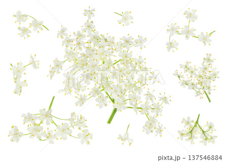 Elderberry flower or Sambucus nigra isolated on a white background with copy space for your text. Top view. Flat lay.