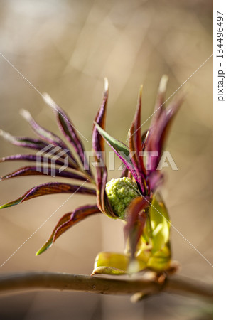 赤い新芽に守られたニワトコの花芽