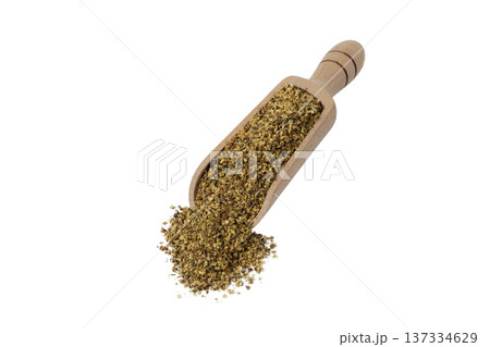 dried flowers of black lilac or black elder in latin sambuci flos in wooden scoop isolated on white background. Medicinal herb.