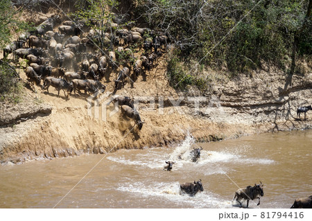 ヌーが川に飛び込む迫力ある風景 ヌーの大移動の光景(ケニア、マサイマラ国立保護区)