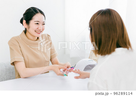 ネイルサロンでパーソナルカラー診断をするネイリストとアジア人女性