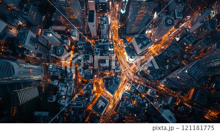 Futuristic cityscape on dark blue background with lighting effect. Innovation city data concept.