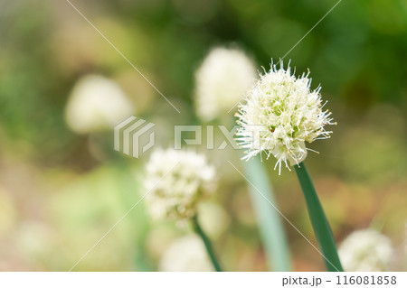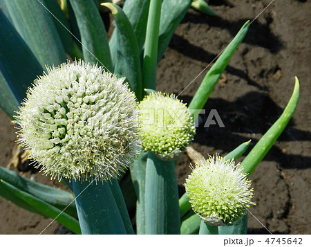 初夏の畑で咲き出したネギの花 ネギ坊主