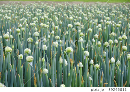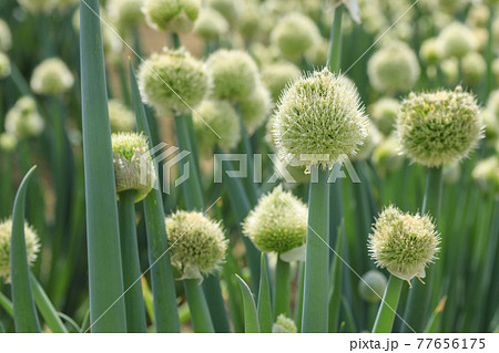 初夏の畑で咲き出したネギの花 ネギ坊主