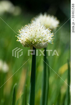初夏の畑で咲き出したネギの花 ネギ坊主