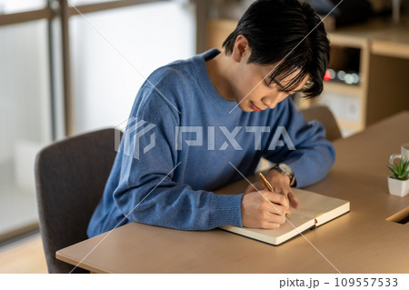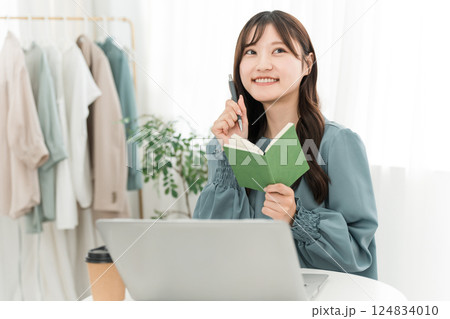 手帳・メモ帳・スケジュール帳に記入する若いアジア人ビジネスウーマン(取材・アイデア・メモ・予定)