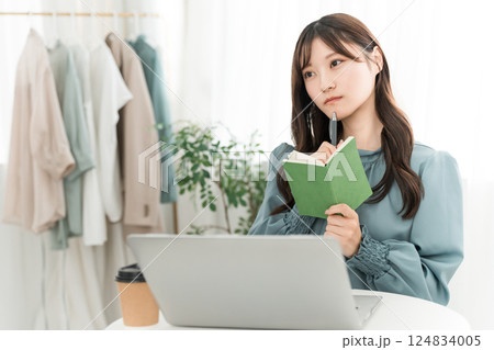 オフィスオフィス,仕事場でメモ帳,ネタ帳を見ながら考える,悩む若いアジア人女性