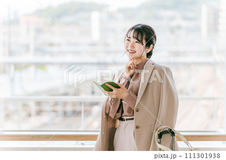 駅・公共施設で手帳を見て考えるビジネスウーマン(スケジュール・予定・アイデア・嬉しい)