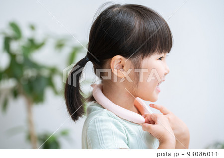 首にクールリングをつけた子供(育児・子育て・夏・熱中症対策)