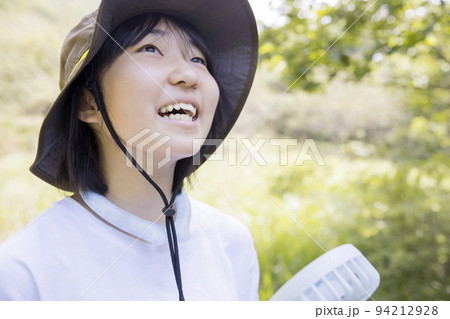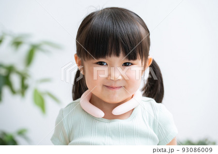暑さ対策イメージ クールネックリングと携帯扇風機で涼む子供
