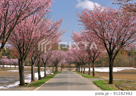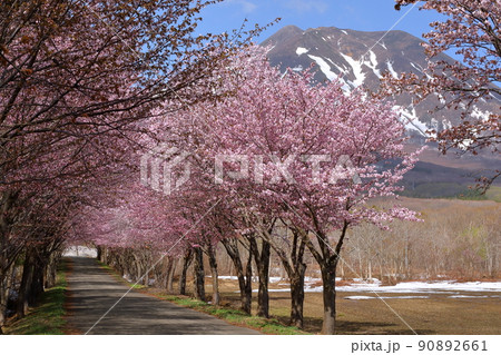 青森県弘前市百沢裾野 オオヤマザクラネックレスロードに面する岩木山総合公園の桜並木と冠雪した岩木山