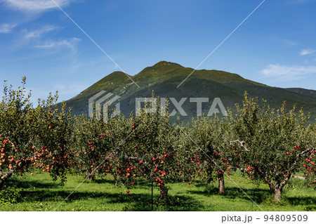 青森県弘前市百沢裾野 オオヤマザクラネックレスロードに面する岩木山総合公園の桜並木と山々の景色