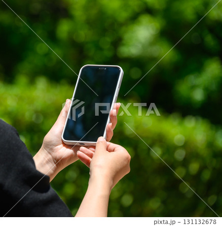 緑の背景でスマートフォンを指で操作する若い女性の手元