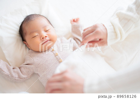 おかあさんの膝の上で眠る赤ちゃん 乳児 新生児 生後22日