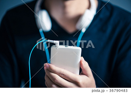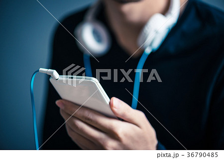 ワイヤレスヘッドホンとスマホで音楽を聴く男性