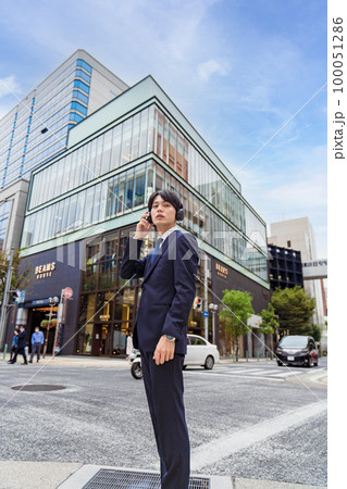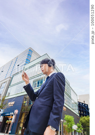 サラリーマンのポートレート 街中 オフィス街 ヘッドホン ヘッドフォン ノイキャン ハイレゾ スマホ
