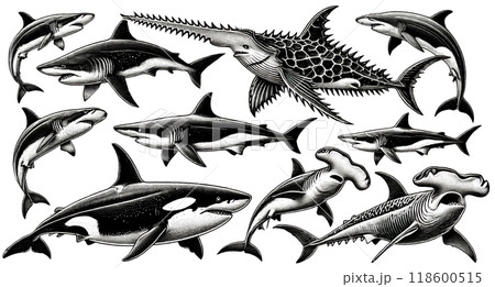 ビンテージスタイルのサメ・シャチのイラストセット/白黒の手描きスケッチ