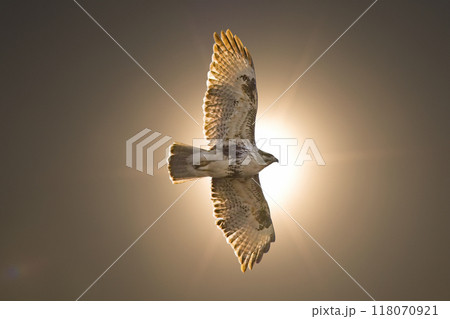 夕日を受けて飛翔する美しいケアシノスリ(タカ科)。 日本国群馬県、利根川河川敷にて。