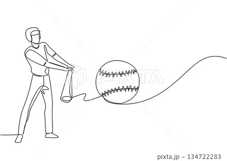 Single line drawing of a man batter swinging toward a softball, sports concept for team spirit, themed for World Softball Day celebrating leagues, tournaments, coaching, and community fans worldwide.