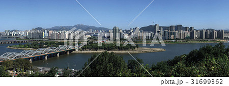漢江大橋とノドゥル島、漢江鉄橋(龍鳳亭近隣公園からの眺望)