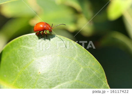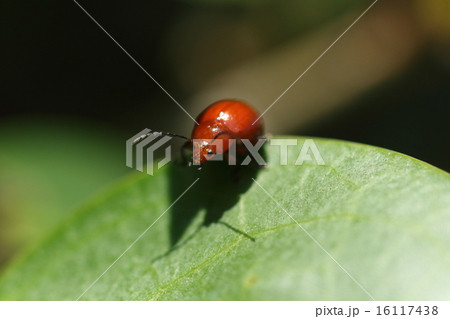 生き物 昆虫 アカイロマルノミハムシ、上翅は鮮やかな赤色ですが胸(前胸背板)は褐色味を帯びます