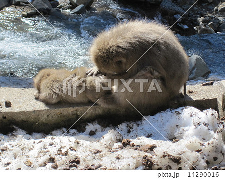 毛づくろい・ノミ取り・グルーミングをする小猿(長野県 地獄谷野猿公苑)