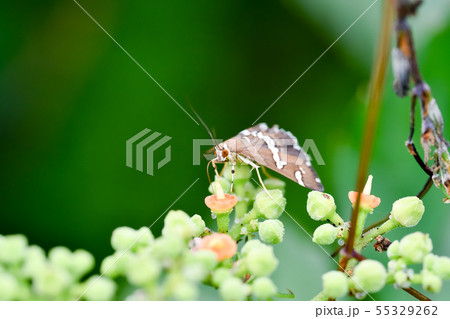 菊の花に止まった、シロオビノメイガの成虫、花と昆虫イメージ素材