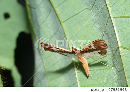 葉先に止まるツトガ科マエアカスカシノメイガ