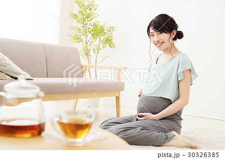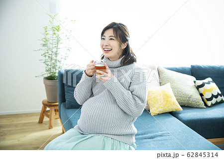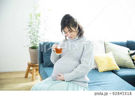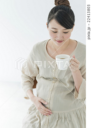 ティータイム 妊婦 ノンカフェイン 妊娠 若い女性 ポートレート