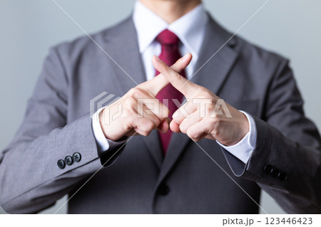 グレーのスーツを着てバツサインをするミドル男性ビジネスマン